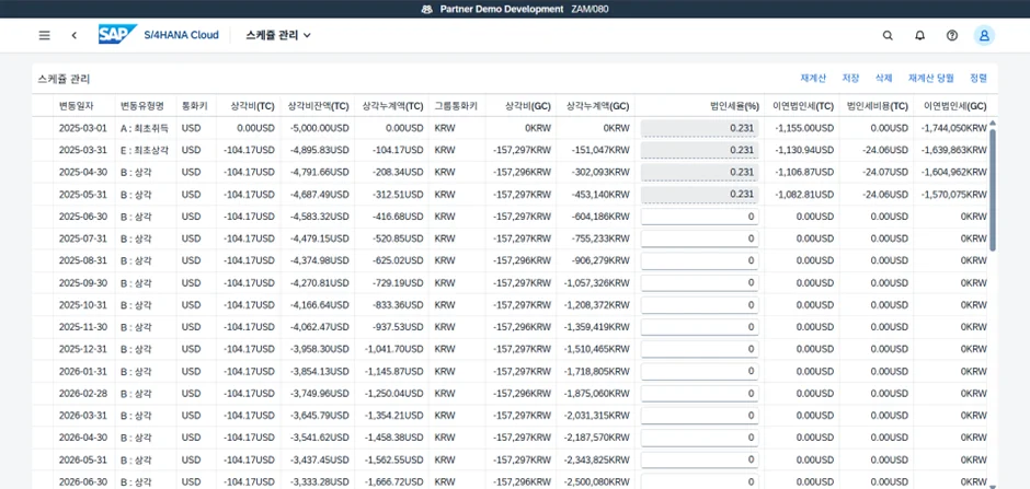 감가상각 스케줄 기반 당기 실현/미실현 금액 재계산