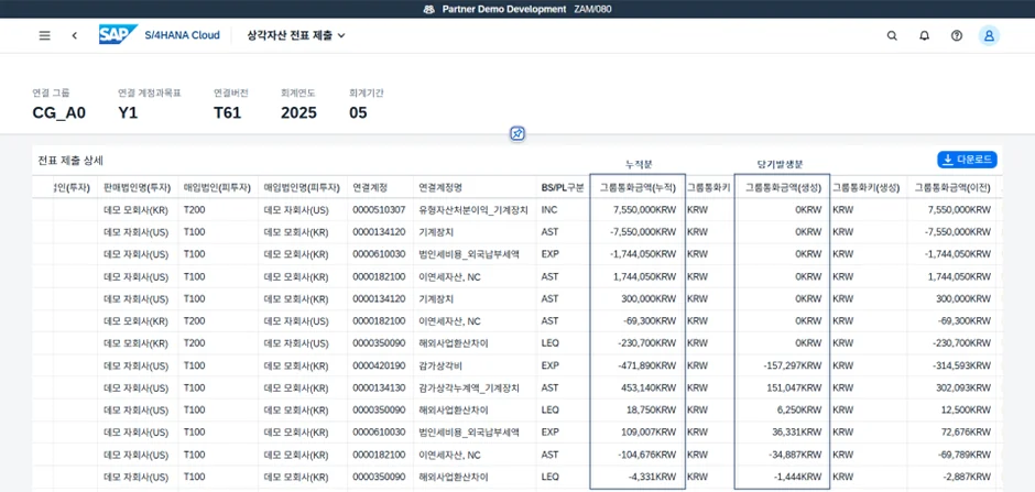 Group Reporting의 표준 기능을 최대한 활용하여 자산 단위의 내부거래 추적, 잔존 내용연수 기반 계산, 그리고 기간별 증감분(Delta) 전표 생성과 같은 요구사항을 충족하도록 설계했습니다.