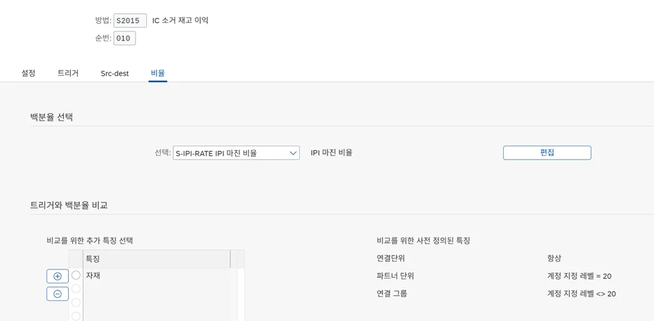연결 단위 간의 재고자산 거래가 발생한 경우, 이에 대한 마진을 소거해야 합니다. 이 때 재고 단위 자재 별 마진이 상이할 경우 아래와 같이 “비교를 위한 추가 특징 선택”에 “자재”를 추가 설정합니다.