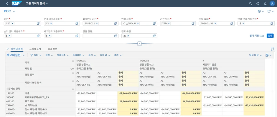 재고미실현 소거 태스크를 실행한 후, 연결 조정 분개를 확인하면 아래와 같이 자재별 마진에 따른 미실현손익이 적정하게 제거되었음을 확인할 수 있습니다.