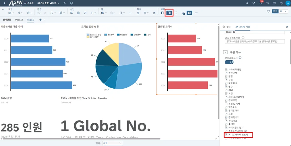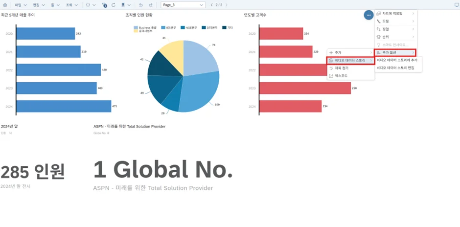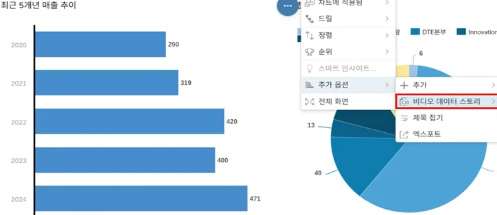 스토리를 뷰(View) 모드에서 실행시키고 차트를 선택한 후 추가 옵션에서 [비디오 데이터 스토리]를 클릭합니다.