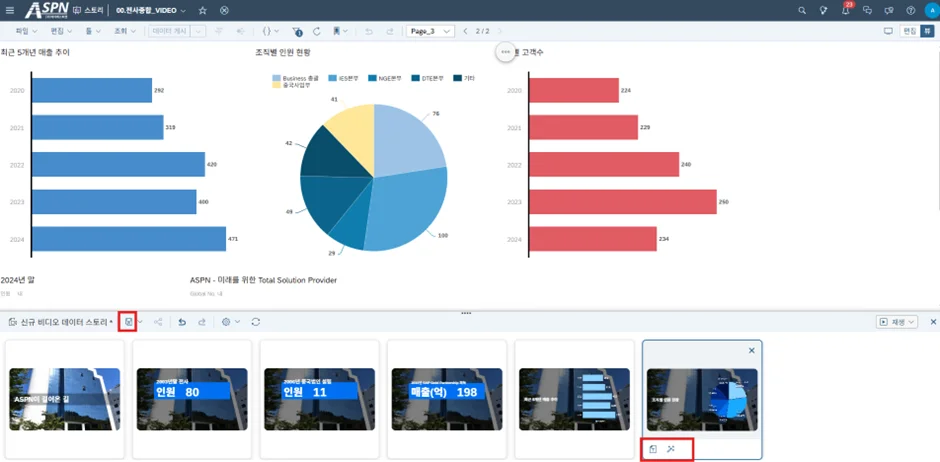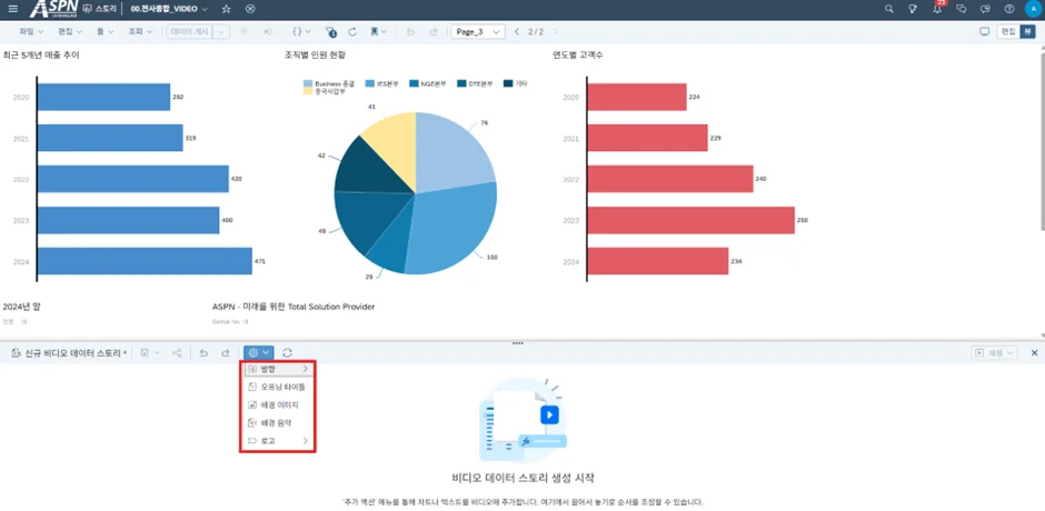 비디오 데이터 스토리(Video Data Story) 기능이란 SAC의 시각화 콘텐츠(차트)를 기반으로 구성된 대시보드를, 자동으로 슬라이드 형태의 동영상을 생성하는 기능입니다.