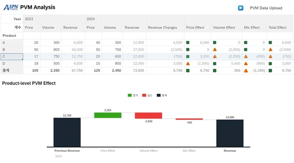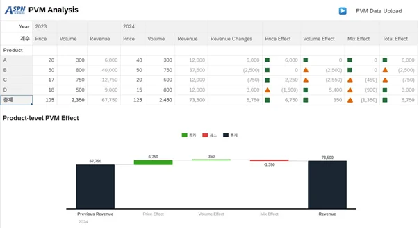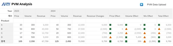 PVM 분석은 특정 제품이나 서비스의 실적 증감 원인을 세 가지 요인(Price Effect, Volume Effect, Mix Effect)으로 분해하여 설명하는 방법입니다.