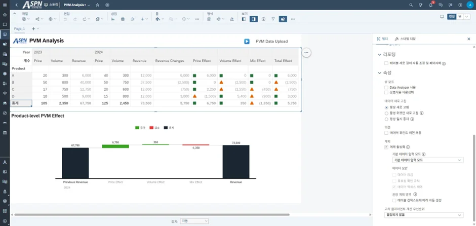연결된 분석 기능(Linked Analysis)을 추가하여 차트를 연동합니다. 테이블에서 제품을 선택하면 해당 제품에 대한 PVM 효과가 시각적으로 표시되도록 설정합니다.